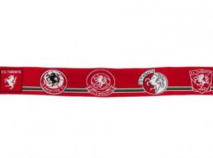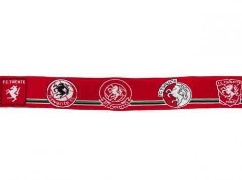 Bijzondere rode sjaal met verzameling van alle vorige logo's en het nieuwe logo van FC Twente. Jacquard geweven van waterafstotend...